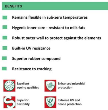 The inner wall of the tube, certified for food, allows the passage of the milk in maximum security without the release of substances hazardous to human health. The outer wall, which is designed, carries responsibility is to protect the pipe from the attack of all those elements, and not only organic, which can be found in a hostile environment like the milking parlor.